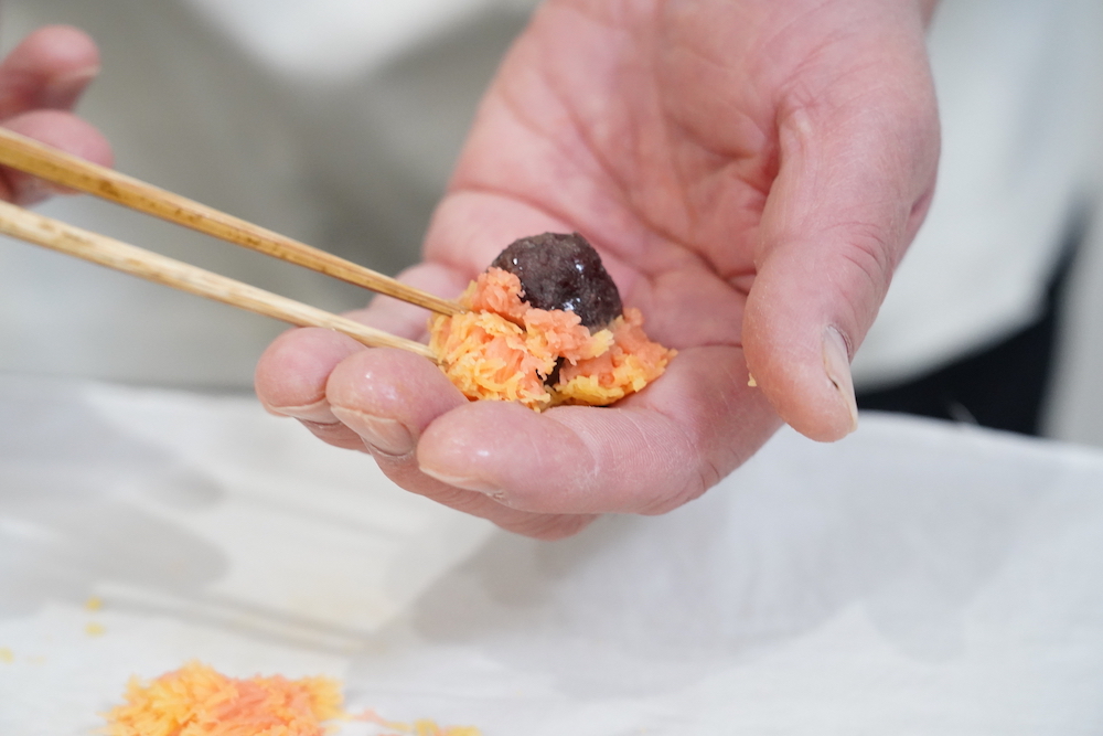 繊細なそぼろを、芯になるつぶあんにそっとなじませるように形づくっていくと、生菓子「錦秋」のできあがり。四季折々の京都を表現したお菓子がいただけるのは上生菓子の魅力です。