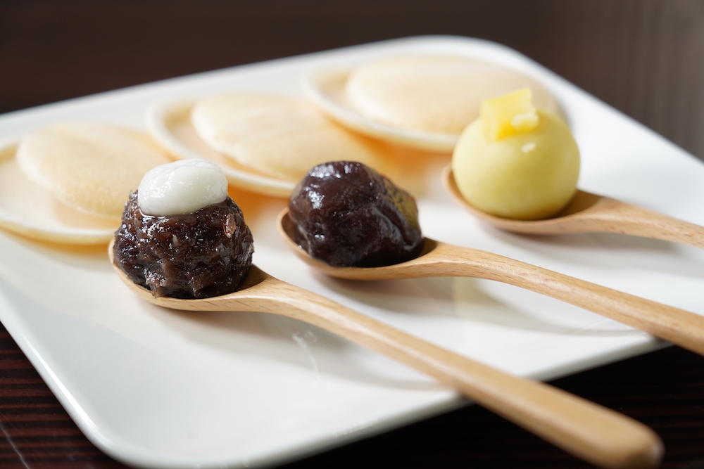 SNSで見て、気になっていたのが「最中3種盛」。木のスプーンの上に粒あん+白玉、こしあん、さつまいもあんの3種類のあんこが用意されています。