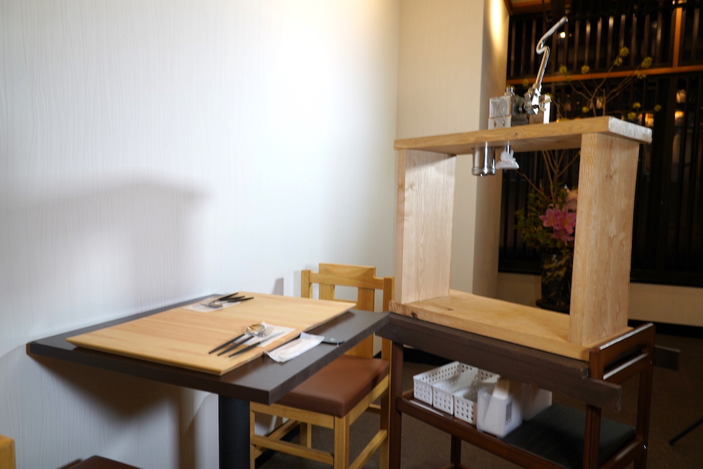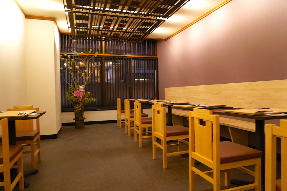 2階に上がると、テーブル席がゆったりと配置されています。和花の生け込みがされていて上品な雰囲気。静かに心が躍ります。