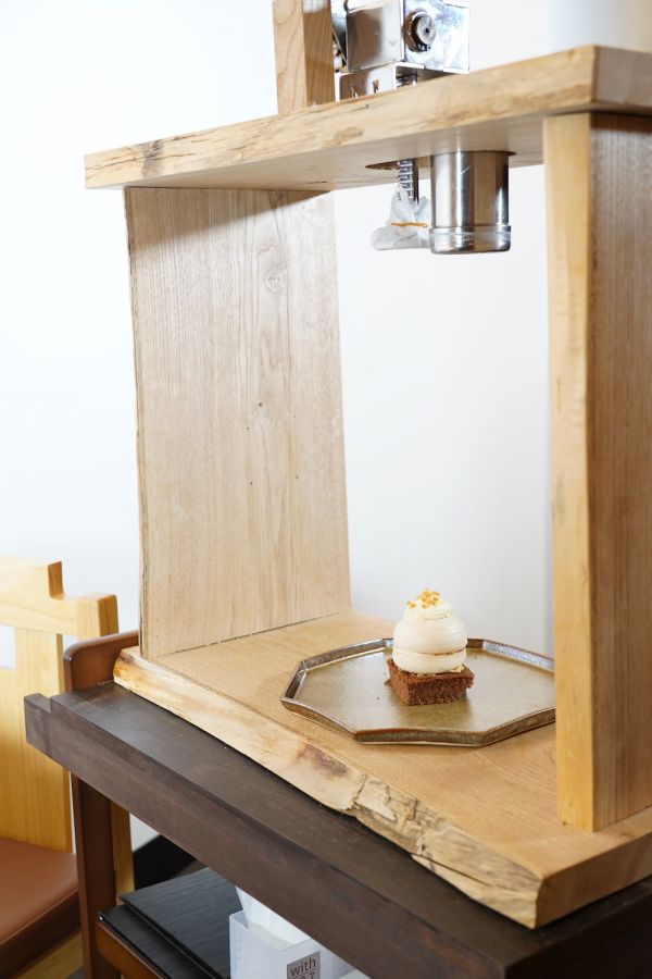 大人気のモンブランを注文すると、テーブルの前まで四角い箱が運ばれてきます。なにやら箱の上にはシルバーのハンドルが付いていますね…!