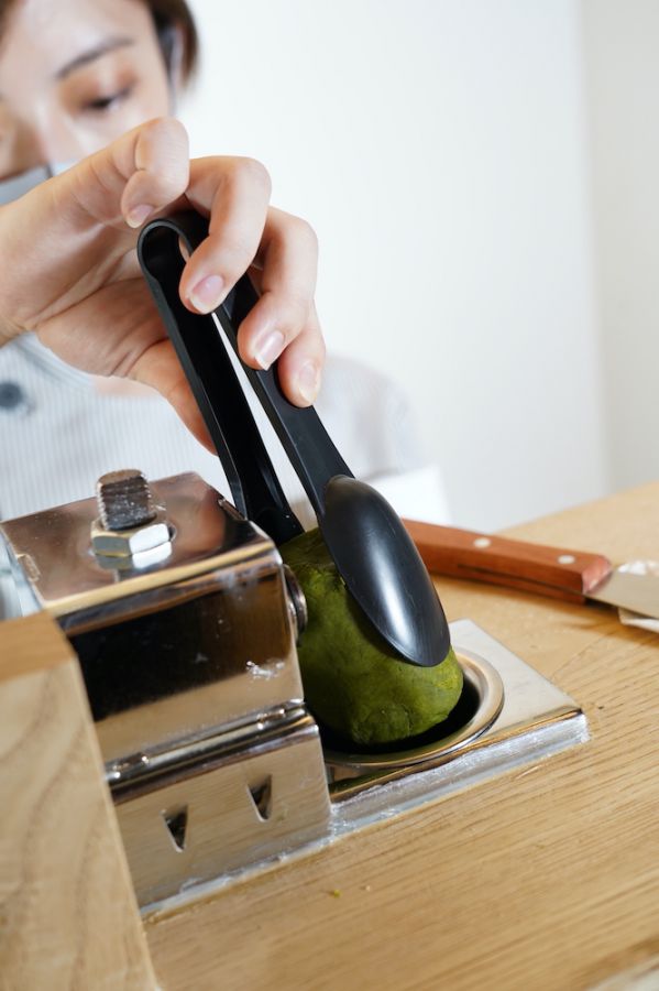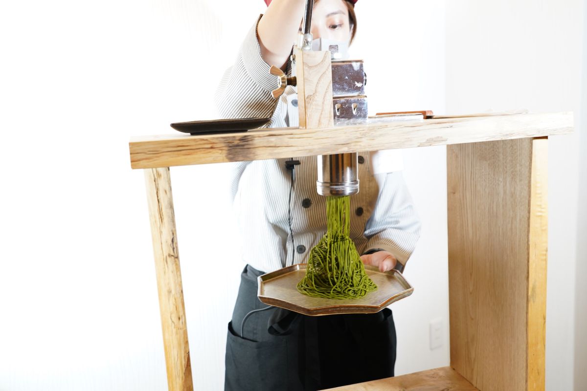 女性のこぶし大くらいの大きなモンブランの“あん”を投入。塊の状態でもすでに上質なお味を約束してくれるような、美しい抹茶の緑色。これだけでもとっても美味しそうです。