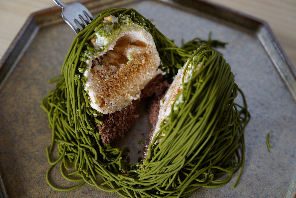 色合い的に“シックな大人のモンブラン”なのが、宇治ほうじ茶モンブラン。最近、京都では抹茶スイーツを追い越しそうな勢いでほうじ茶スイーツが流行っているので、これからこちらも人気になってくる予感!絞られた瞬間から、焙じた茶の香りがたちこめます。