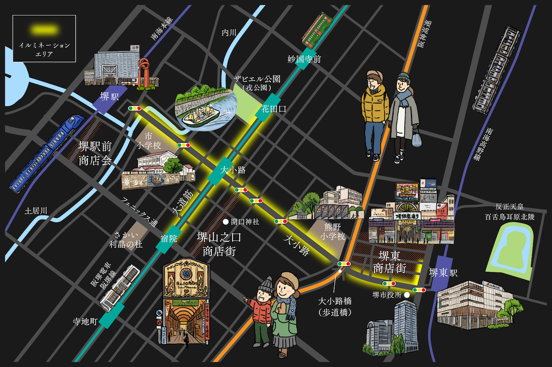 光の粒が輝くのは、南海高野線「堺東」駅から南海本線「堺」駅までをつなぐ「大小路シンボルロード」の約1.8㎞と花田口交差点から宿院交差点をつなぐ、「ちん電」が走る「大道筋」の0.8㎞です。