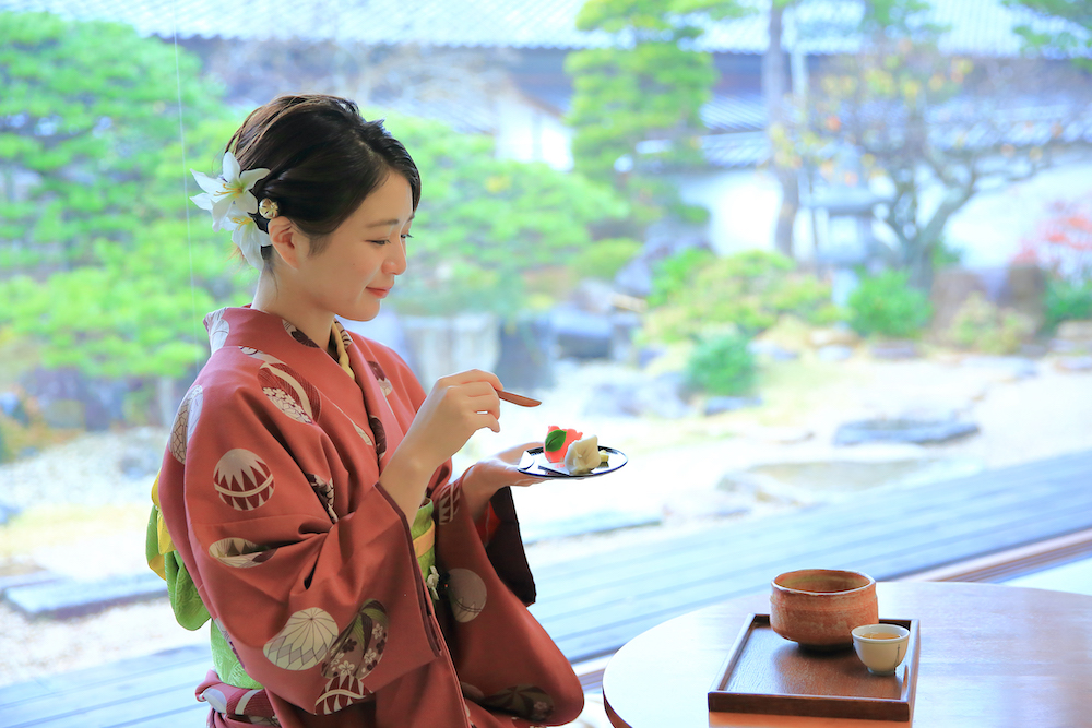14:30~ 日本庭園を望む広々とした大広間で和菓子ティータイム