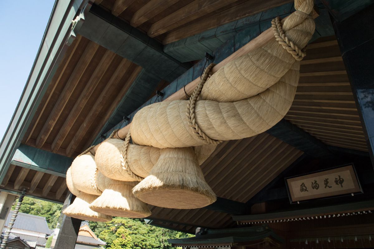 出雲大社で有名なみどころといえば、境内の西側にあり日本最大級の注連縄(しめなわ)が迫力満点の神楽殿(かぐらでん)。長さ約13.6m、胴囲約8m、重さ約5.2tという巨大さ!絶対に写真に収めたい場所はここです!お見逃しなく。
