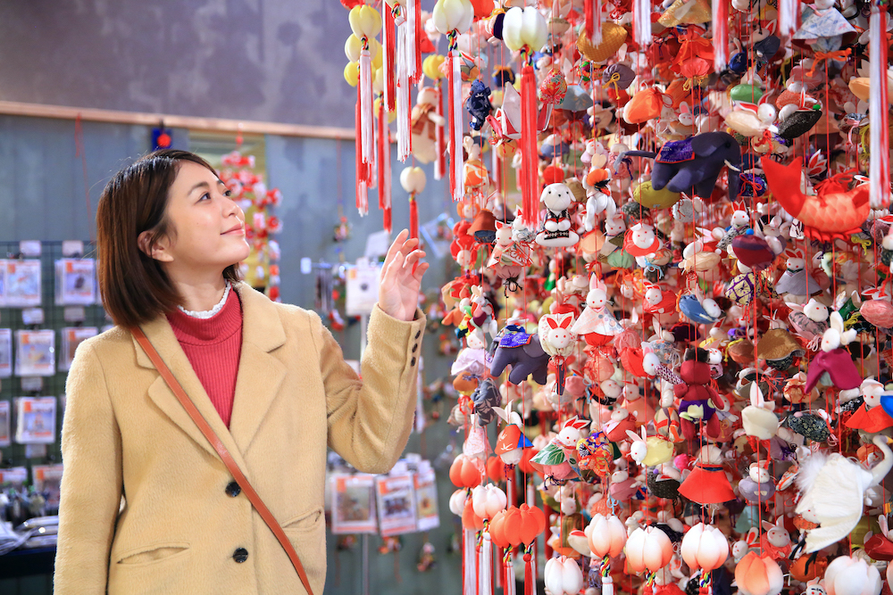 願いや感謝の気持ちを込めて作る小さなうさぎの“ねがい雛(びな)”を集め、2019年11月に2万1911個をつないだつるし雛シンボルタワーが完成。その数で世界ギネス記録にも認定されました。ねがい雛ミュージアムはそのツリーの展示のために建てられた施設で、ねがい雛にまつわるグッズも販売しています。