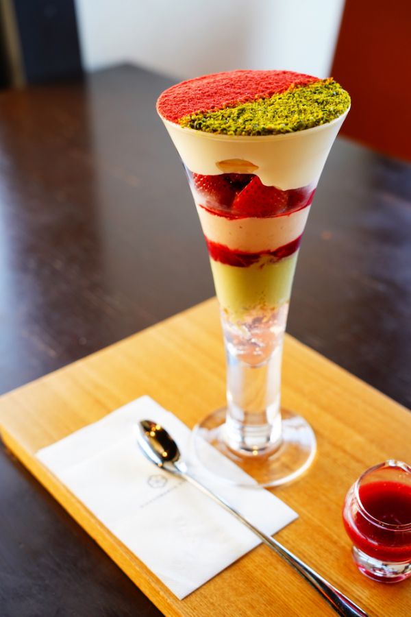 お待ちかねの季節限定パフェは、「聖夜のノエルピスターシュパフェ」。こちらは2020年12月1日(火)~25日(金)の25日間限りの期間限定提供です。表面の赤と緑のクリスマスカラーは、ドライいちごと砕いたピスタチオで表現。ピスタチオの食感とドライいちごの甘酸っぱさがたまりません!