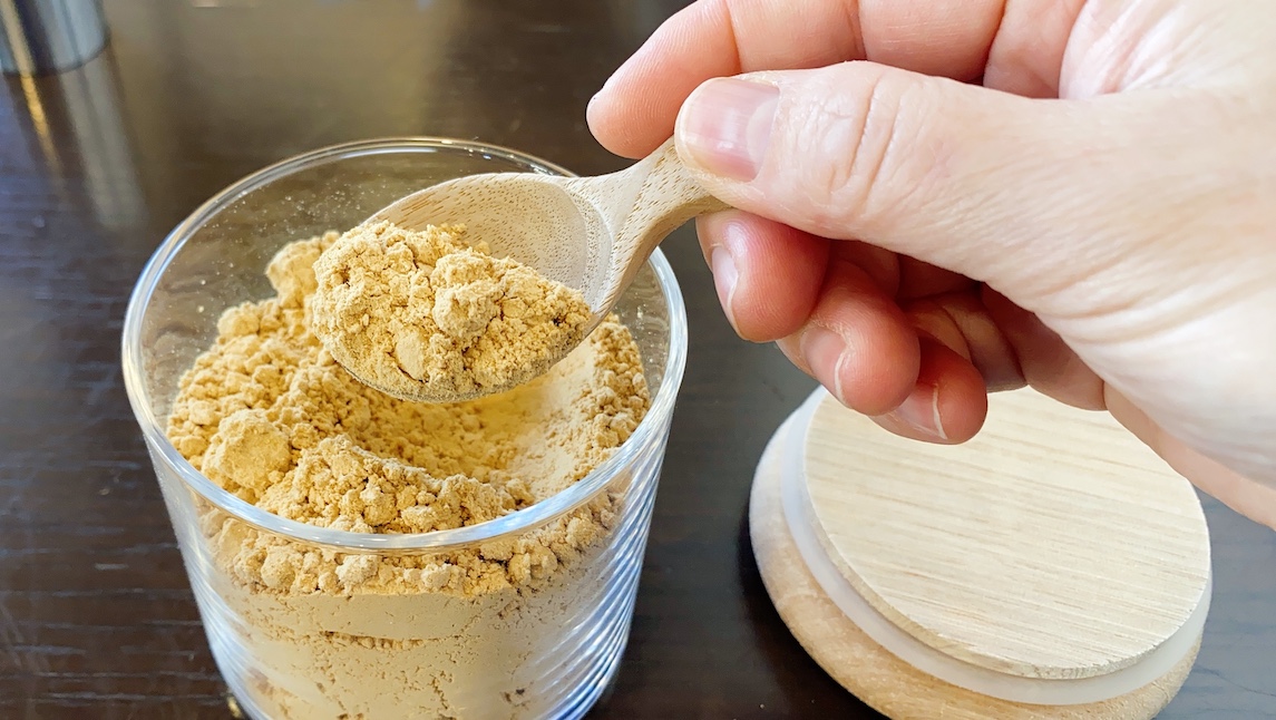 各テーブルに“追いきな粉”が用意されているので、どのメニューにも自由に好きなだけきな粉を追いがけすることができます。こちらのきな粉はミヤギシロメ大豆のきな粉。