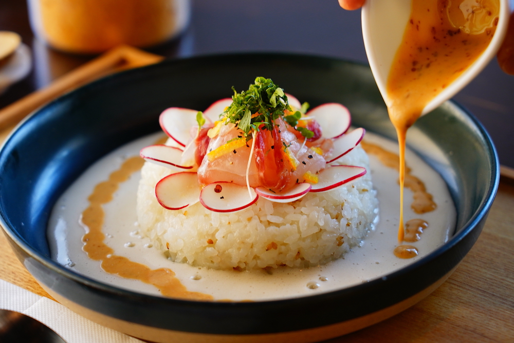 泡のおだしにもしっかり味がついていますが、ミヤギシロメ大豆のきな粉を加えた胡麻ダレを加えると、味にさらなる奥行きがでます。