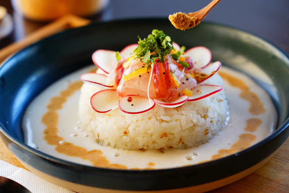 きな粉と相性がよいのは、スイーツだけではありません。クリーミーな泡のおだしに絡めて食べる丼ぶり「京の華やぎ丼」には、特製きな粉スパイスが。このきな粉スパイスが非常に美味なんです。