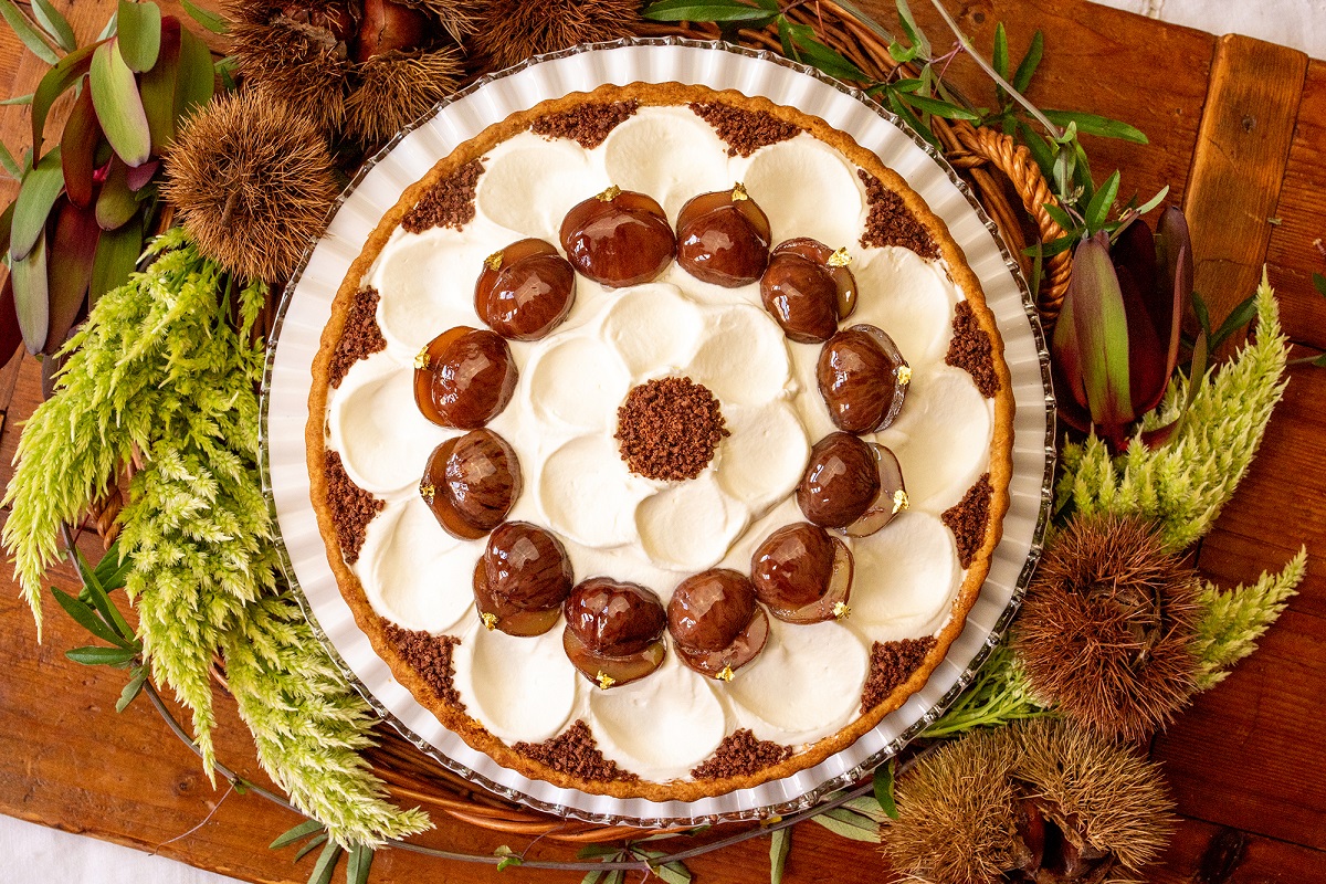 「マロンショコラのタルト」piece723円/whole(25cm)8791円は、刻んだチョコレートを加えたアーモンドクリームをじっくりと焼き上げ、濃厚なマロンクリームとたっぷりのクリームを組み合わせたオリジナルモンブランです。