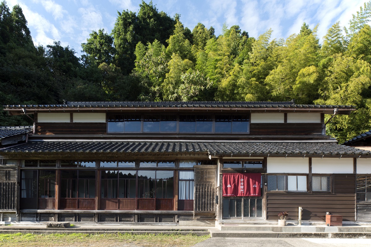 チェックインは「里山まるごとホテル」の中心施設である「お食事処茅葺庵」で。鍵とアメニティを受け取り、車で約3分の「中右衛門」へ向かいます。昔ながらの田舎道の奥に見えるえんじ色ののれんが「中右衛門」の目印。目の前に広がる田園と建物の背後に迫る山々が圧巻です。