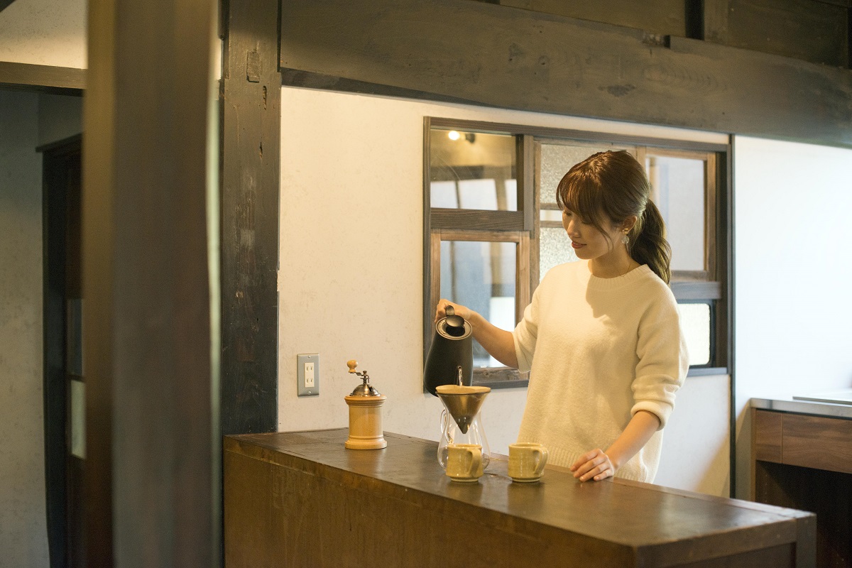 古民家宿に戻ったらお茶で一服。キッチンにはコーヒー豆と冷茶が用意されていて、自由に飲めます。コーヒーは能登の老舗喫茶店「中央茶廊」が焙煎したスペシャルティコーヒー。薫り高く、やさしい味わいです。地元のおばあちゃんが摘んだ薬草の冷茶も、飲みやすくっておいしい! 宿でも地元の味が楽しめるなんてうれしいですね。