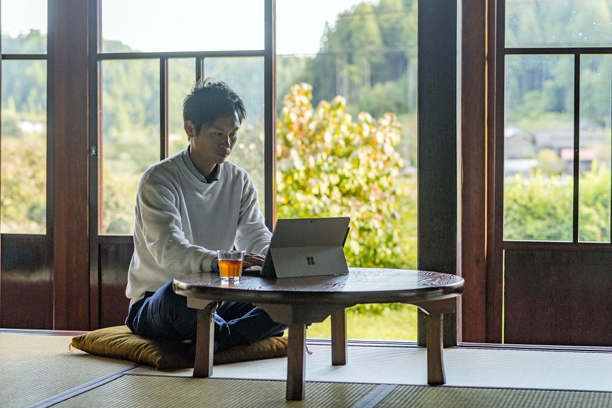 ガラス窓に面した広い和室では、足を伸ばしてくつろいだり、寝転んだり、リラックスタイムに最適です。広大な里山の景色をバックに、昔ながらのちゃぶ台で、ゆっくり本を読んだり、ちょっとした調べものをしたりするのも絵になる旅のひとこま。