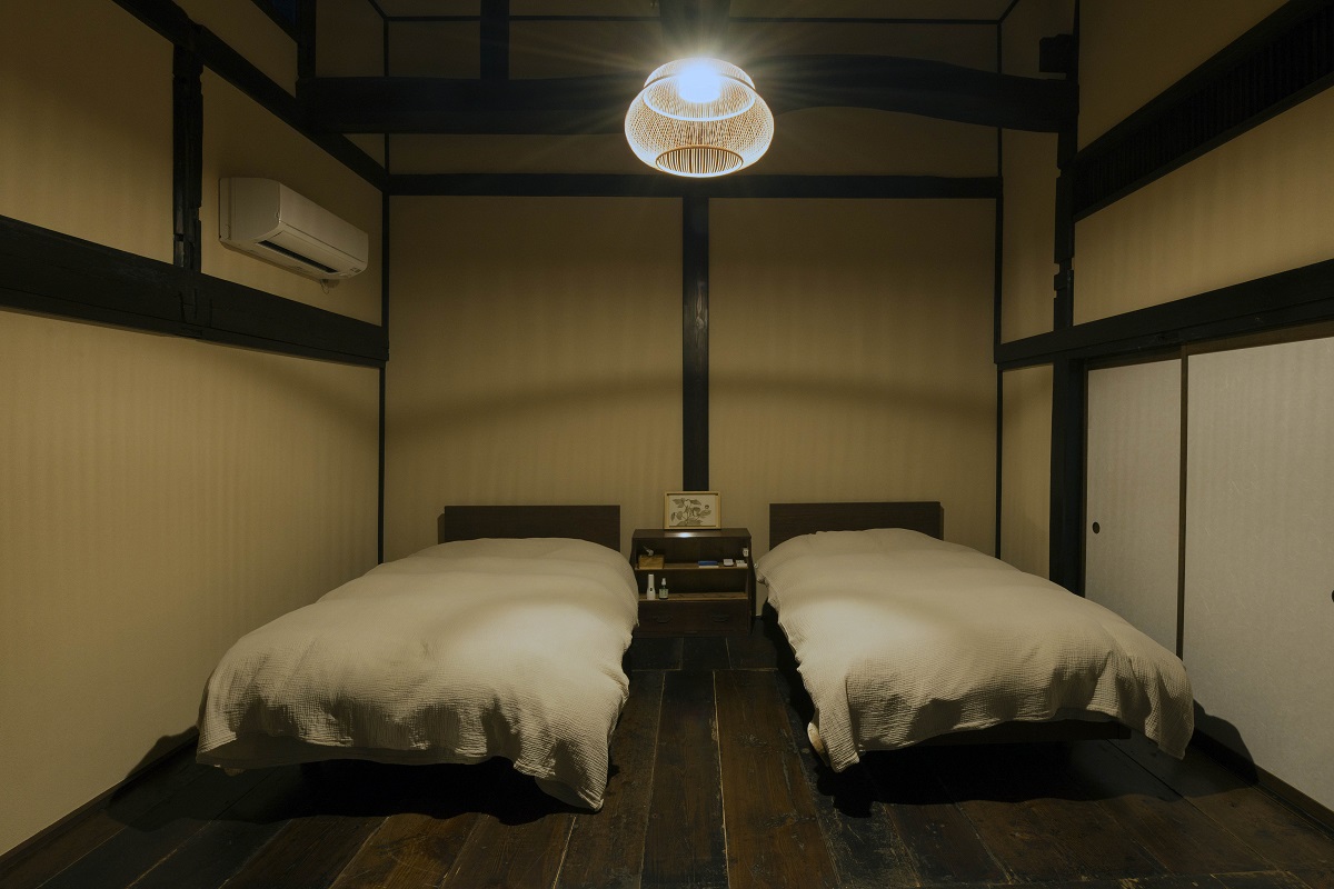 シンプルモダンなベッドルーム。寝具は体に優しいオーガニックコットンを使用しています。ベッドのほか、和式布団が3セット準備されていて、5人まで宿泊可能です。友だちと布団を川の字に並べて寝るのも楽しそう。晴れた夜には空を覆いつくす星を眺めて深い眠りへ。