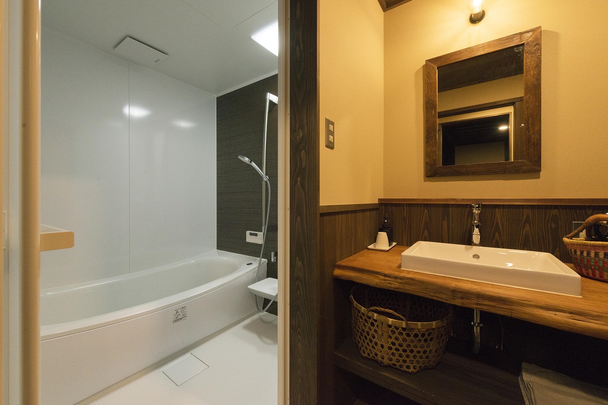 バス、トイレ、洗面所は最新の設備を導入。湯舟は足を伸ばしてゆっくり浸かれる広々サイズです。まるで自宅にいるような快適さ。洗濯乾燥機やアイロンも設置されていて、長期滞在もOKです。