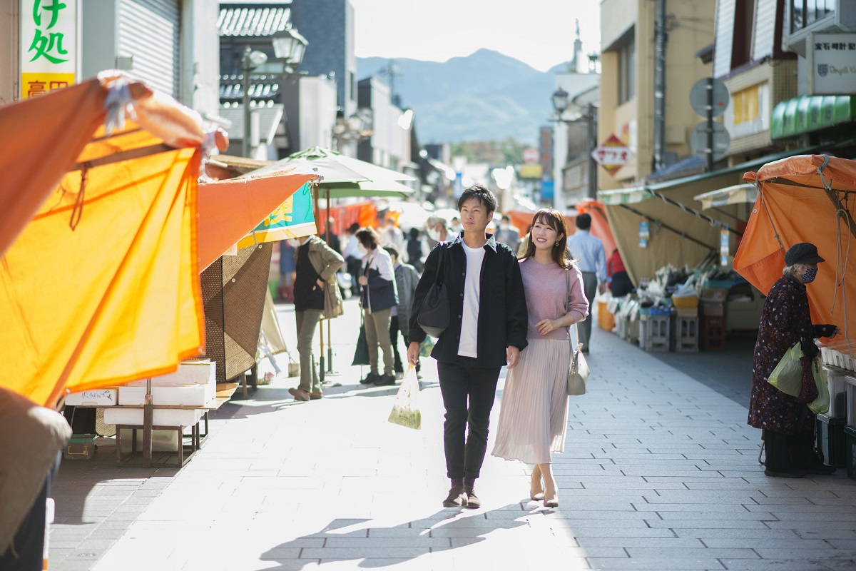\ 大賑わいの朝市で「輪島ふぐ」の干物などお土産選びを楽しんで /