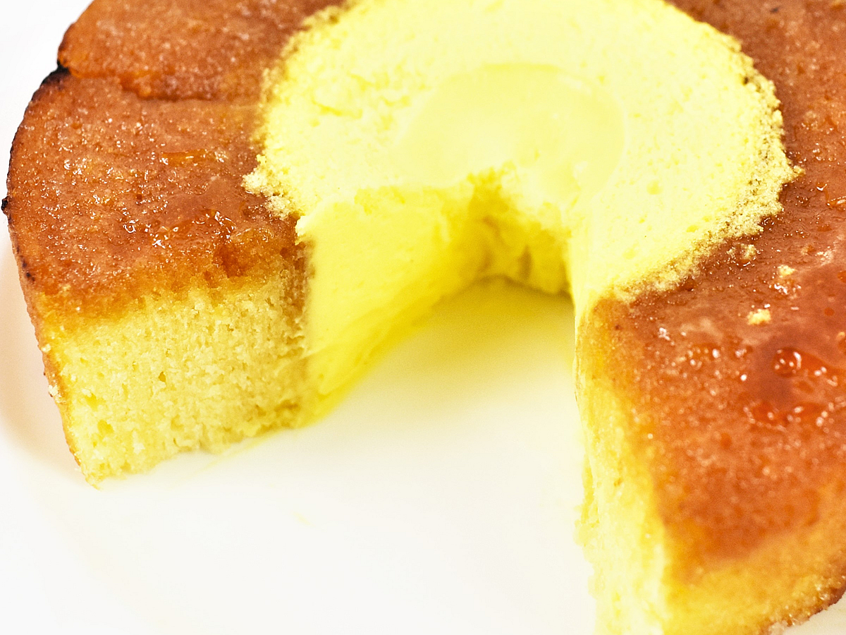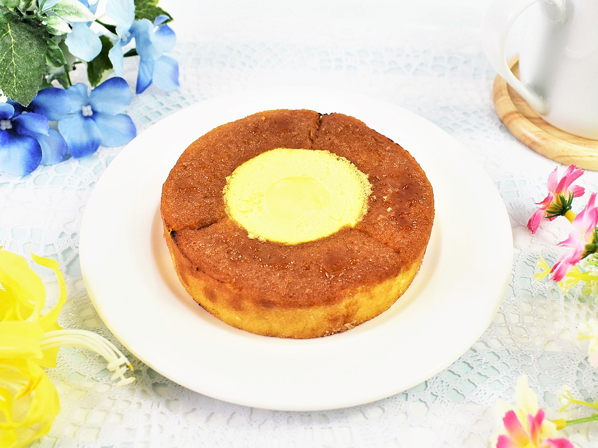 ドーナツ状のバウムの真ん中にカスタードクリームが埋め込まれている「キャラメルのブリュレ仕立てバウム」。一口食べて感じたのは、焦がしキャラメルのほろ苦さです。意外にもバウムの甘さは控えめで少々大人の味わい。キャラメル部分のジャリジャリとした食感も楽しめるため、バウムだけでも大満足のおいしさですよ。