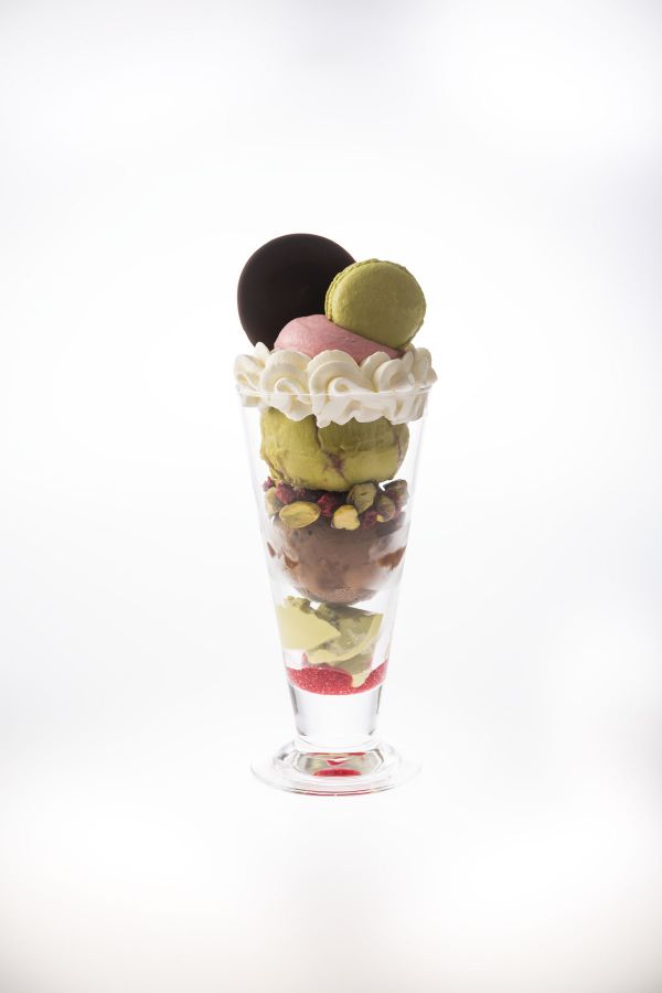 見た目もかわいらしい「シーズンパフェ ピスタチオフランボワーズ」(1500円・税抜)は、ピスタチオのブランマンジェやフランボワーズの生クリーム、ピスタチオマカロンと、どこを食べても大満足の贅沢なパフェ。