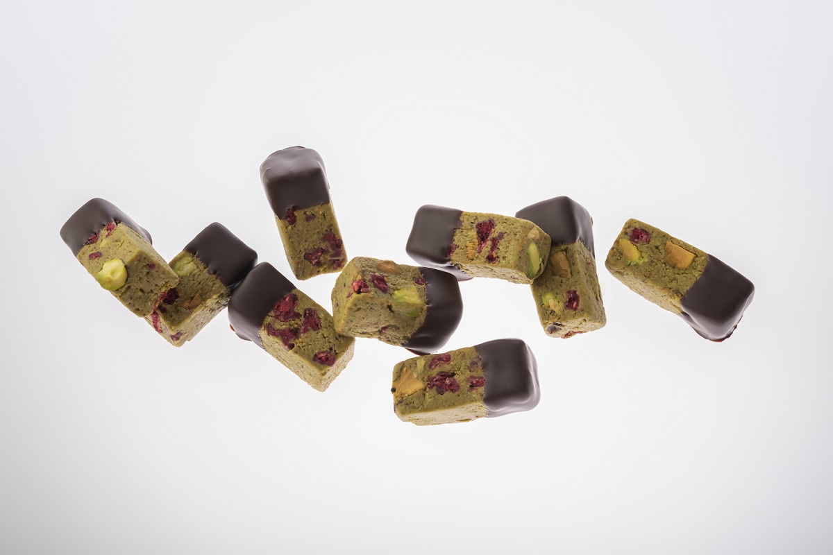 限定チョコレートは「グルマンディーズ ピスタチオ」 (30円/g・税抜)。濃厚なピスタチオのペーストとホワイトチョコレート、フランボワーズに、ビターチョコレートのコーティングがアクセントになっています。