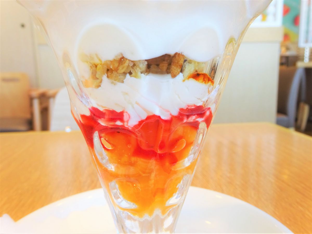 グラスの中には、甘酸っぱいイチゴのソースにオレンジのクラッシュゼリーも。多彩なフルーツの共演を楽しみながら、飽きずにペロリと完食できました。