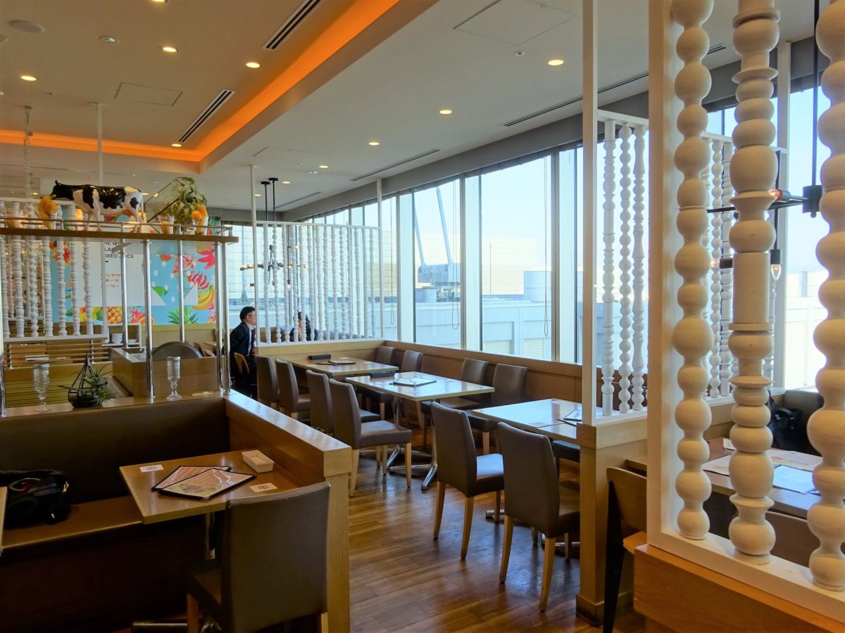 白が基調の落ち着きある店内は、牛の置物や不思議な模様の格子など、ユニークな装飾がアクセント。大きな窓からは周辺の景色が一望でき、誰もがのんびりと過ごせそう。各テーブルの間隔が広く、密になりにくいのもうれしいポイントです。