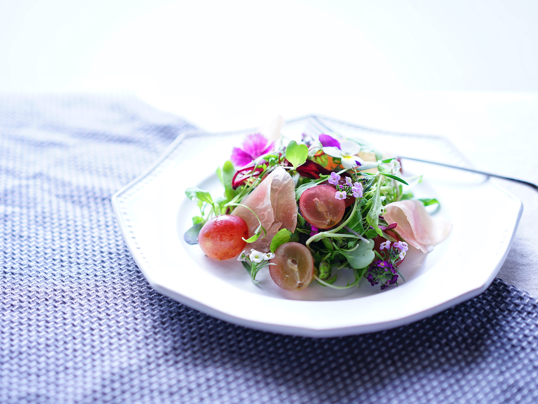 エディブルフラワー活用①【ぶどうと生ハムのサラダ】