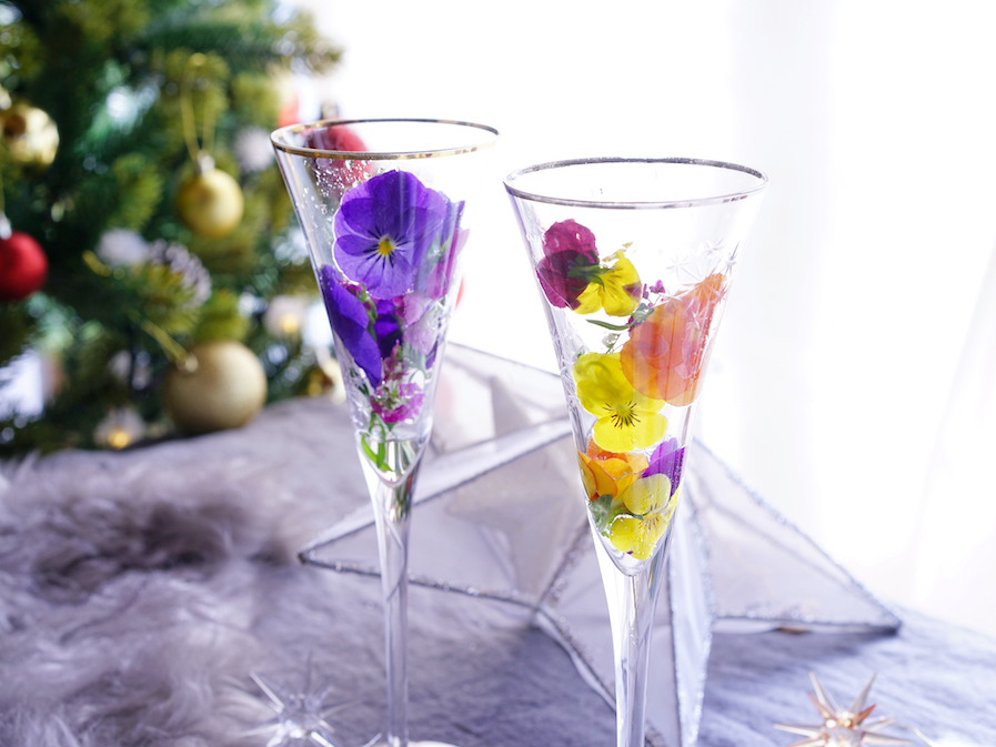 好みのエディブルフラワーをグラスに入れて、シャンパンを注げば、ハイセンスなおもてなしの1杯に。