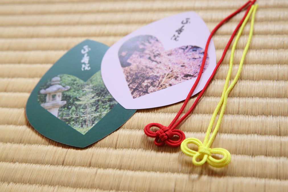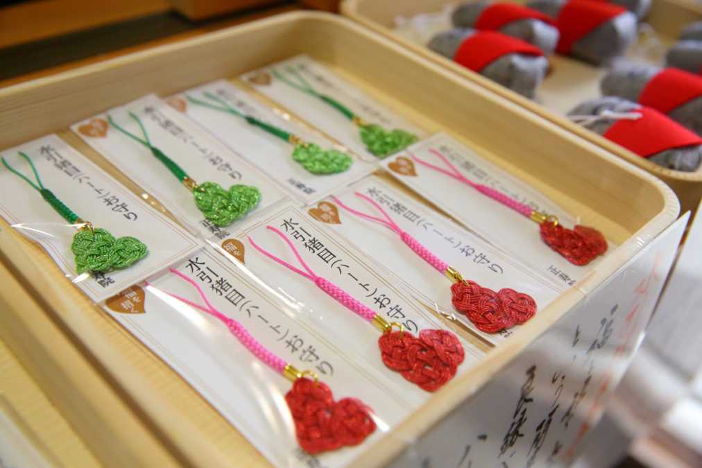お参りが終わったら授与所へ。健康・仕事・恋愛など、さまざまな良縁が長持ちするという、ハート型の「水引猪目お守」を販売しています。