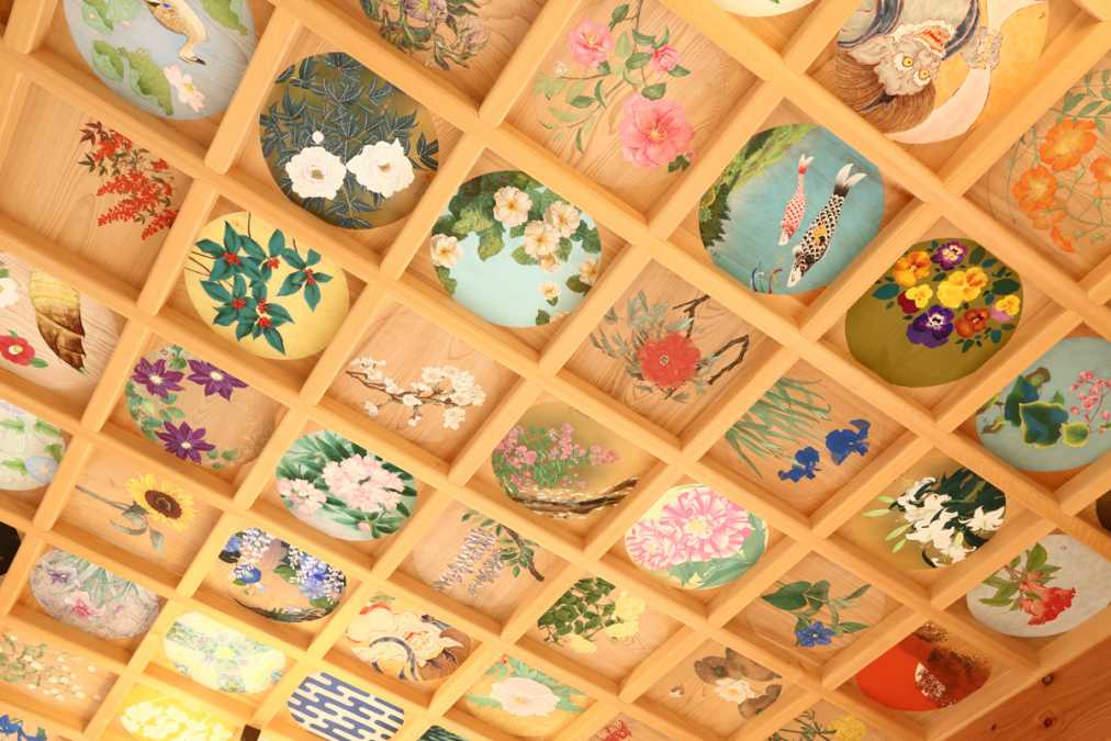 客殿の天井に描かれた160枚の絵は、多くの日本画家や芸術大学の協力によるもの。ヒマワリやアヤメなどのお花のほかに、よく見ると舞妓さんや風神雷神の絵もあります。お気に入りを探してみるのもいいですね。