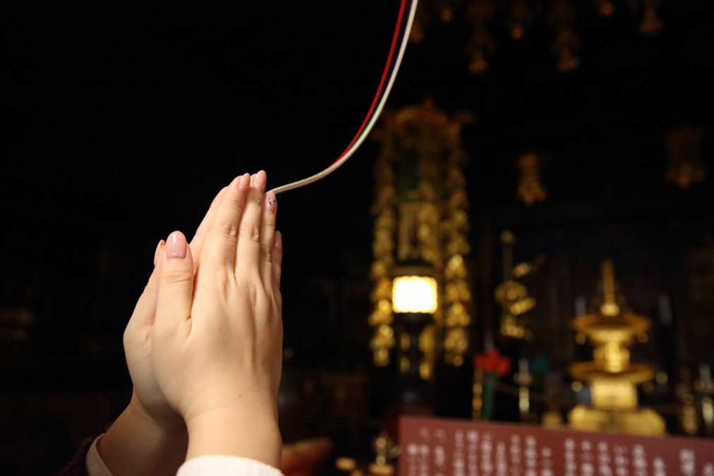 ご本尊である十一面観音は、50年に一度しかその姿を見ることができず、通常は十一面観音の指に結ばれた「結いの紐」を手で挟みながらお願いごとを伝えます。