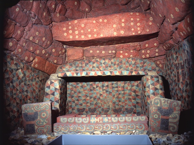 王塚古墳は、6世紀前半に造られた前方後円墳で、石室内に豊富な文様が描かれた装飾古墳です。現在、壁画が描かれた古墳の中で国の特別史跡に指定されているのは、王塚古墳と奈良県の高松塚古墳、キトラ古墳の3つ。王塚古墳の特徴は、石室内の全面に描かれた文様が最多の6色(赤・黒・緑・白・黄・灰)が使われ、色彩豊かな豪華絢爛な装飾壁画で、石室の内部は、石屋形や石枕、灯明台が設置され、精巧な構造になっています。実物の王塚古墳の壁画は春と秋に特別公開されます。