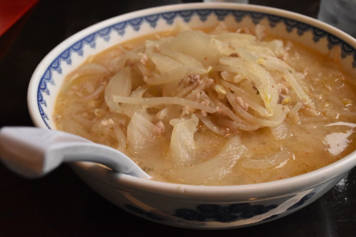 ニンニクやトウガラシをブレンドした白みそベースのスープに、たっぷりとトッピングされた玉ねぎが特徴的なラーメン。ニンニクにたっぷり玉ねぎって結構ヘビーそう…と思う方もいると思うのですが、これがとってもおいしいんです!
