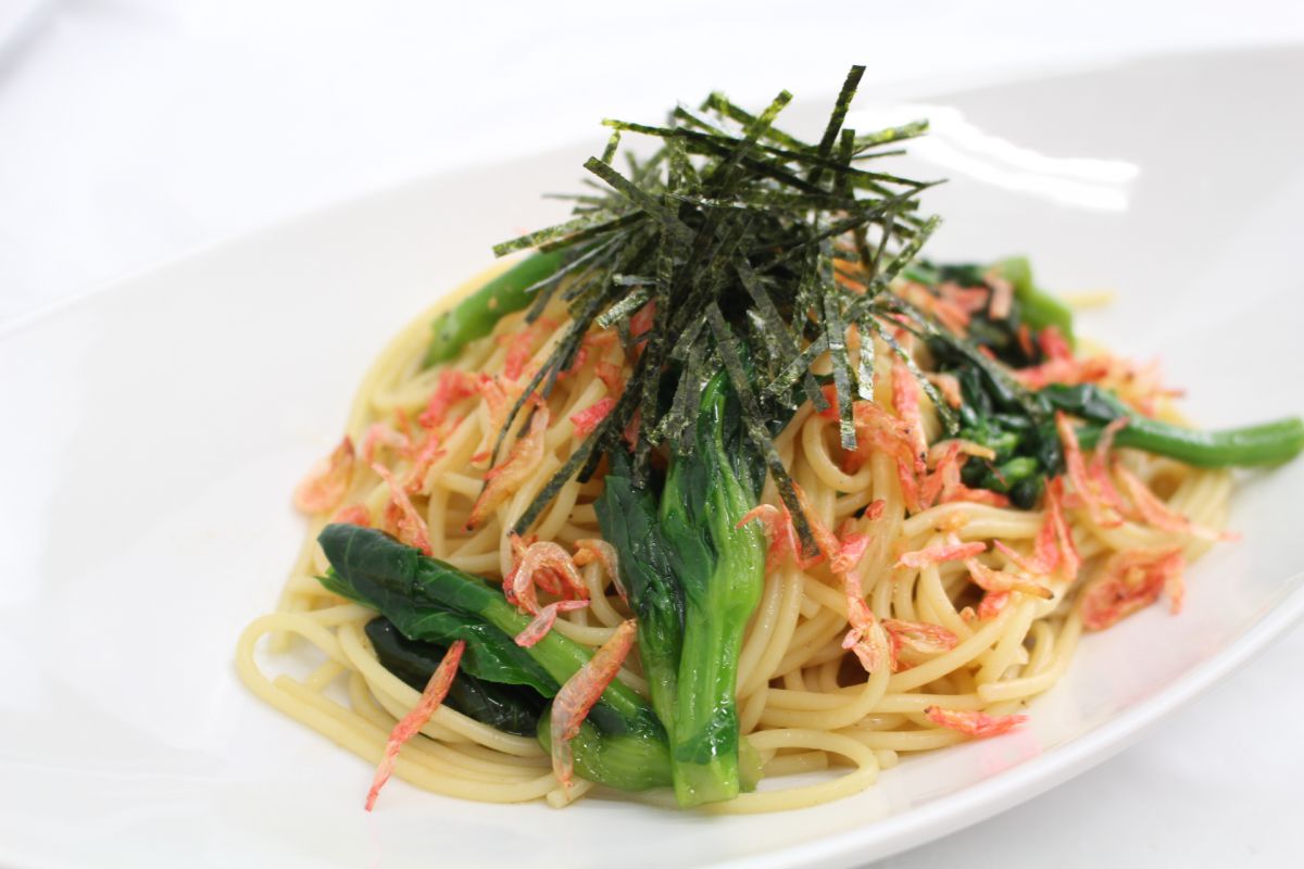 “桜えび”がポイントの和風パスタ「菜の花パスタ」1000円は、ひと足早く春を感じられるこの時期のおすすめメニューです。