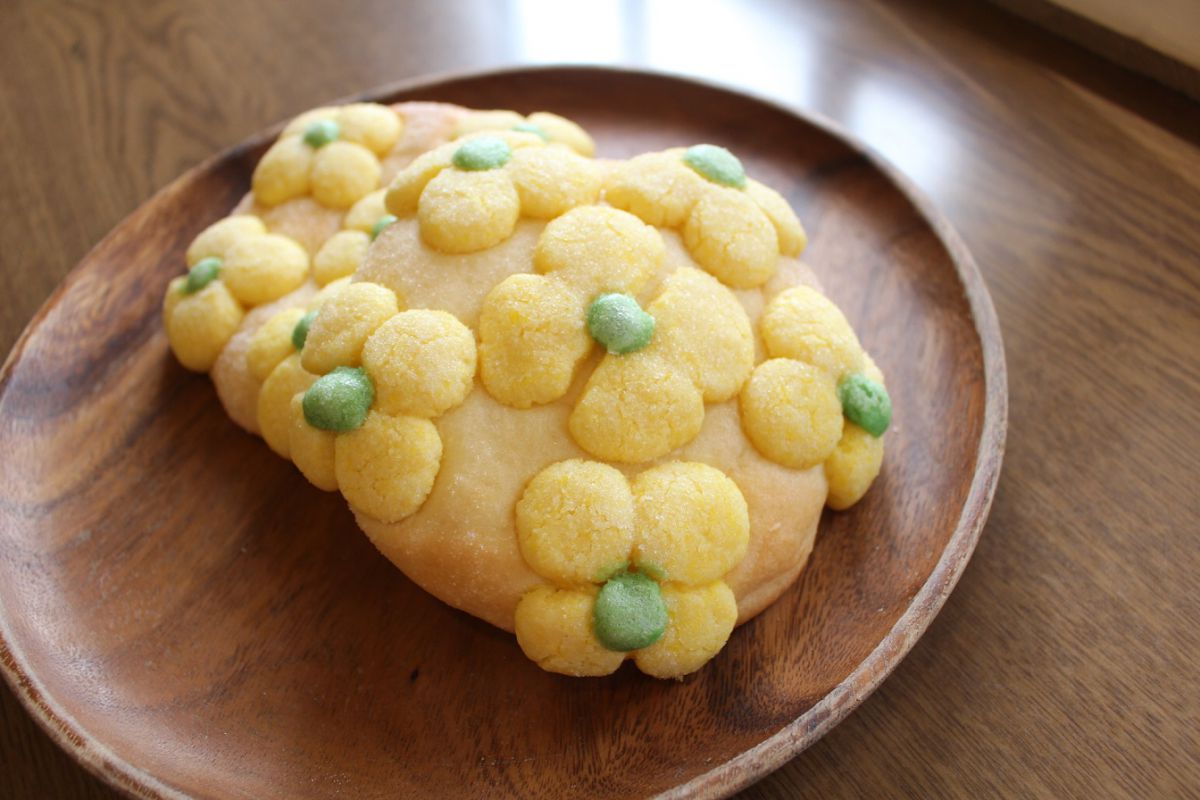 食の体験教教室では、クッキー生地で花型にデコレーションして、かわいいメロンパンが作れます。「菜の花メロンパン作り」は1人1200円です。