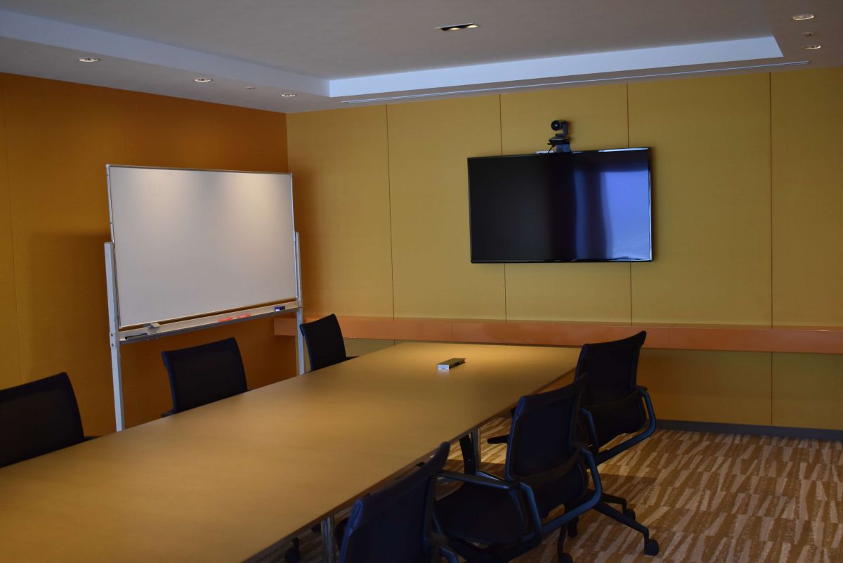 こちらは要予約制の会議室で、モニターやホワイトボードを完備。リモート会議用のカメラもあります。至れり尽くせり。