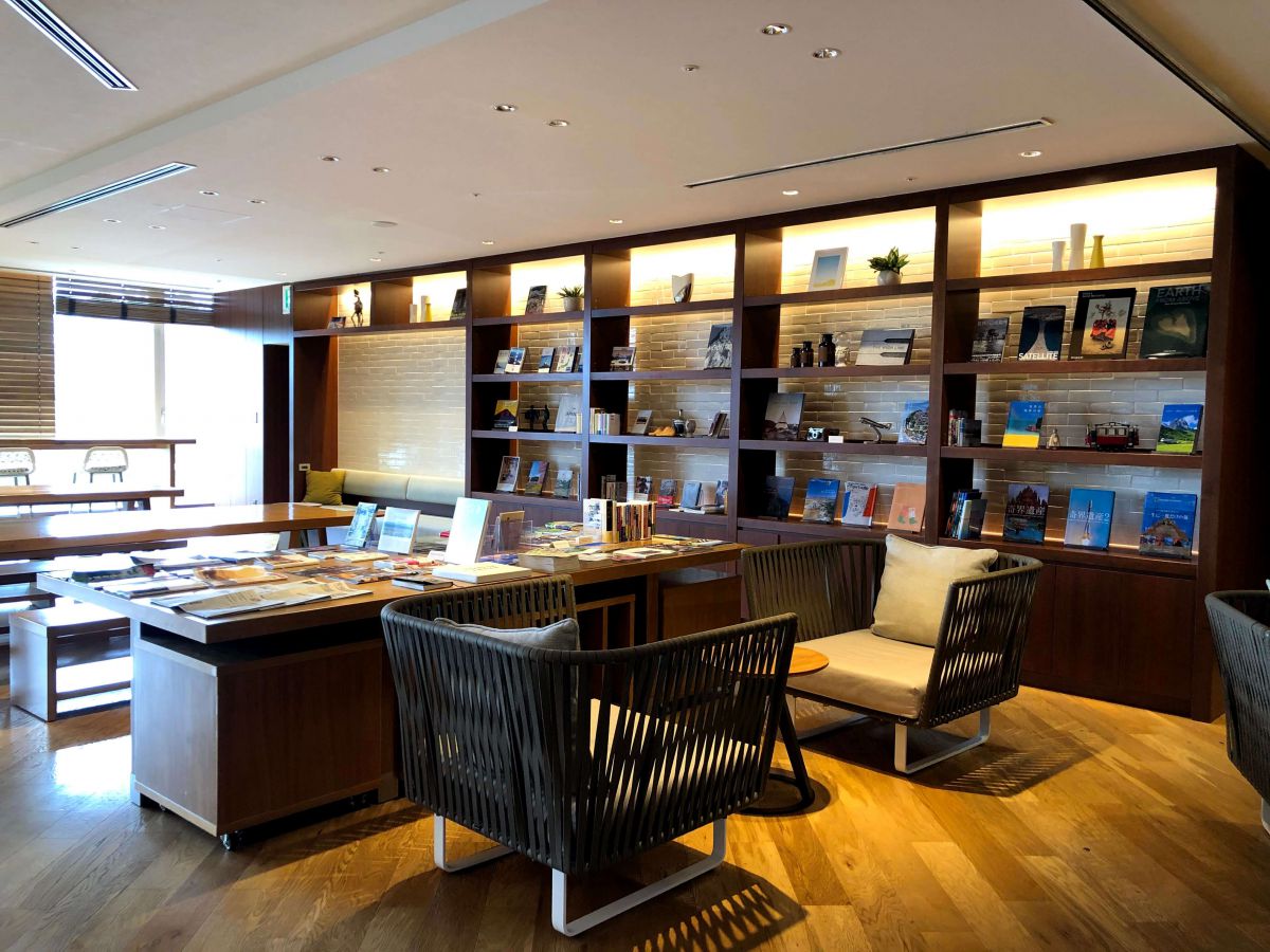 そして、フロントと同じ2階にある「風待ちテラス」へ。ここはラウンジとカフェが一緒になった宿泊者専用エリア。「風待ち」とは、船が帆を張って出航しようとしている様子を表す言葉で、”準備万端”のような意味合いがあるとか。
