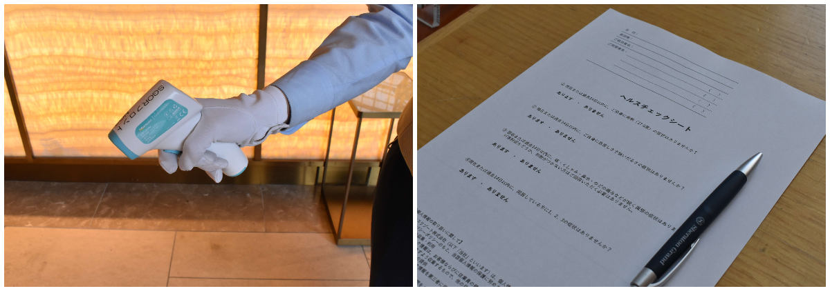 チェックイン時には検温やヘルスチェックシート、追跡シートなどを記入します。