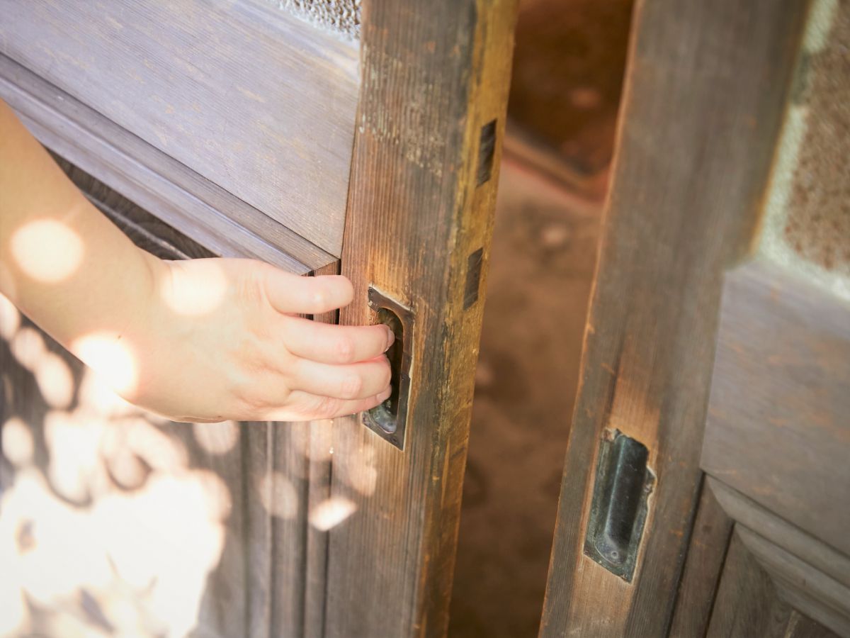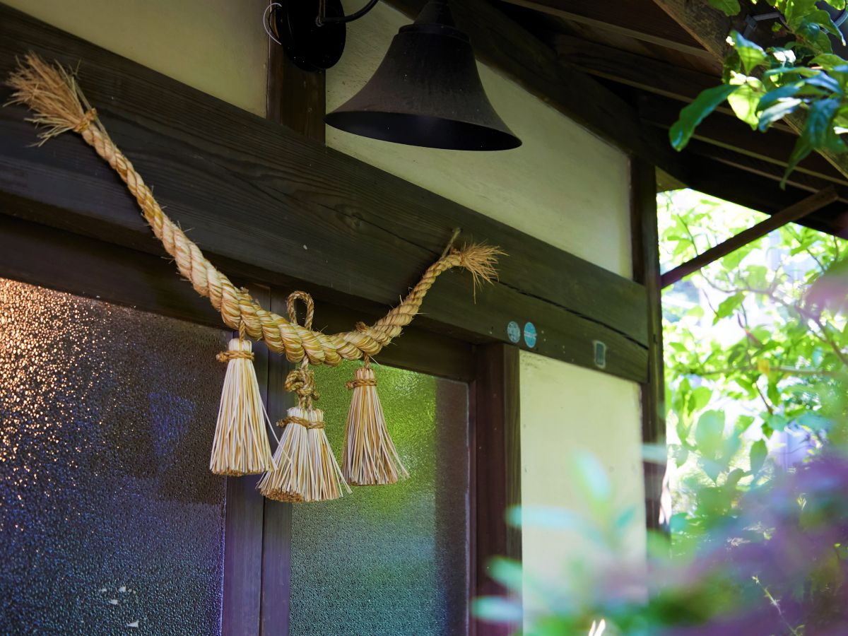 門から中の様子をチラリと覗いてみると……、一見普通の民家のようで入るのをためらいがちなのですが、ぜひ勇気を出してその先へ!門扉をくぐり少し進むと、しめ縄が飾られた入口に到着。
