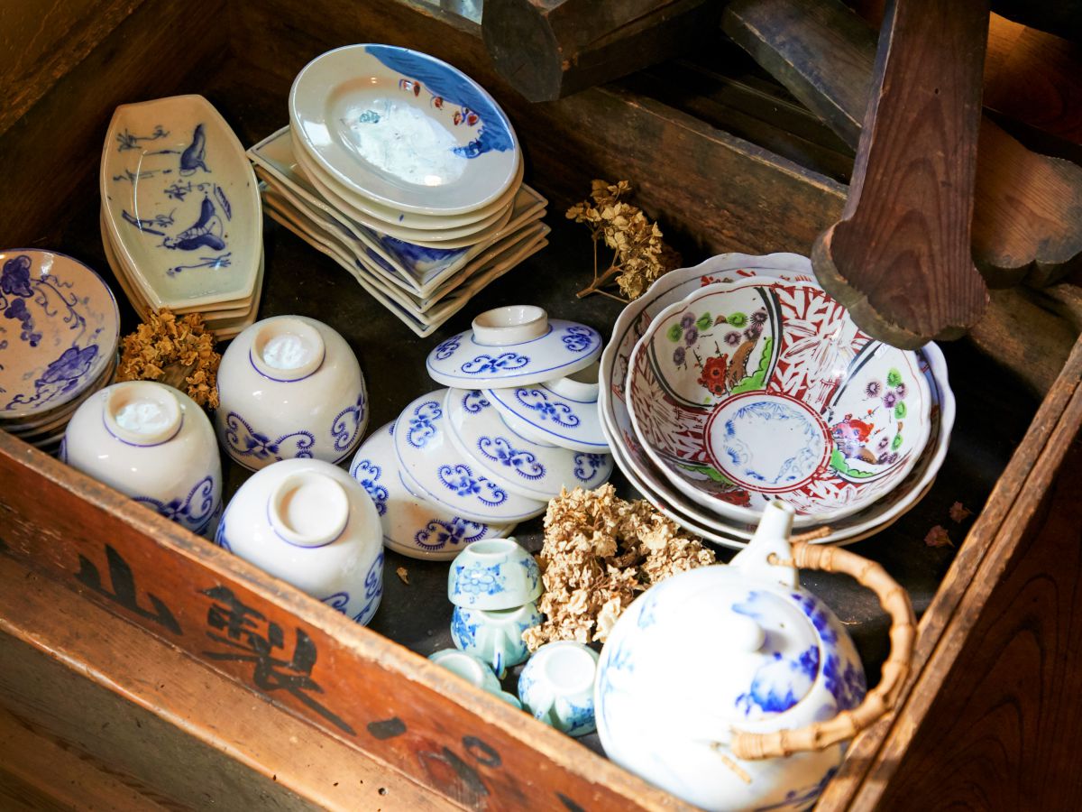 入口にあるアンティークの和食器は購入することもできるんです。1点1000円前後からと比較的お手頃価格。
