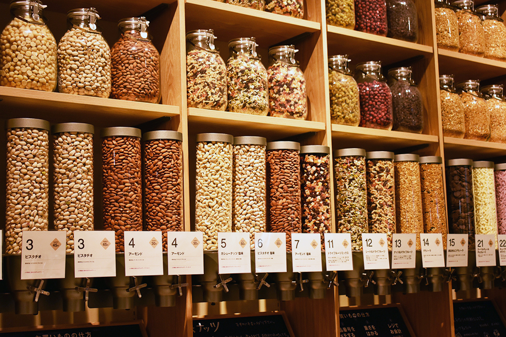 お菓子やコーヒー、雑穀、ナッツ、ドライフルーツなど50種類の食品から必要なものを必要なだけ購入できる食品量り売りのコーナーは“食品を無駄にしない”というサステナブルなスペース。