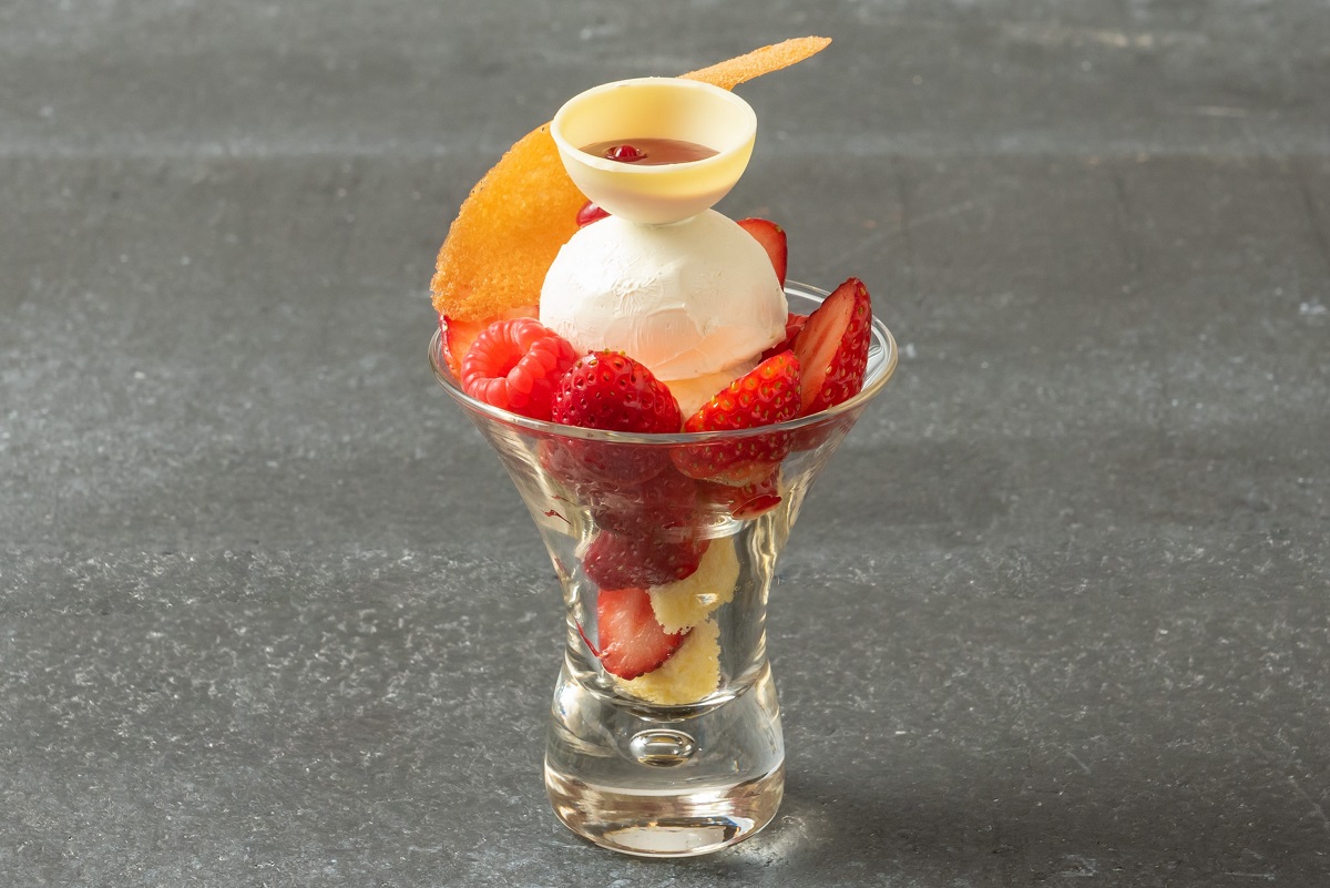 大注目のスイーツは、横浜の馬車道アイスを使用したストロベリーパフェ。温かいラズベリーソースをかけると、ホワイトチョコレートがとろりと溶けだし、ストロベリーの酸味と絶妙に絡みます。ムービージェニックを狙うのにもおすすめ。