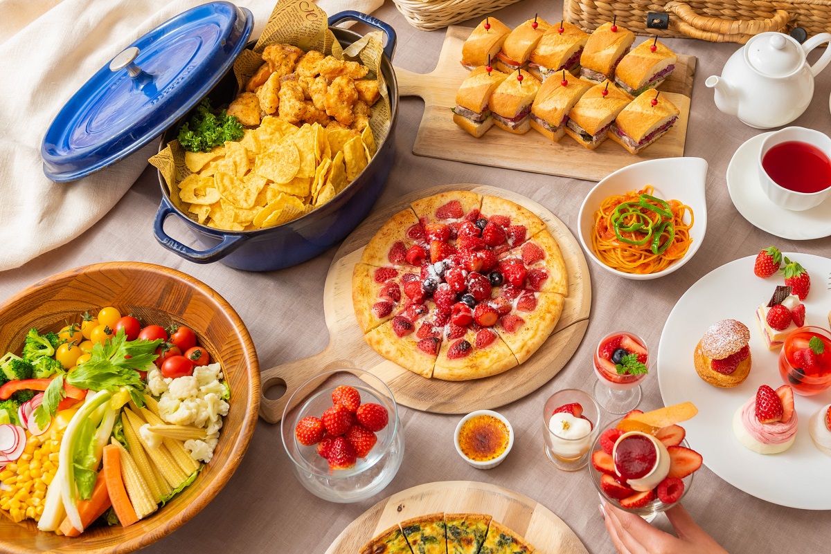 人気不動の定番いちごスイーツ「ストロベリーショートケーキ」や「苺のミルフィーユ」、「ストロベリーモンブラン」に加え、「苺とマスカルポーネのピザ」や、「フルーツグラタン」、「苺大福」など、すべてのスイーツに、佐賀県の新ブランド『いちごさん』をふんだんに使用したペストリーシェフ自慢のスイーツが勢ぞろい。