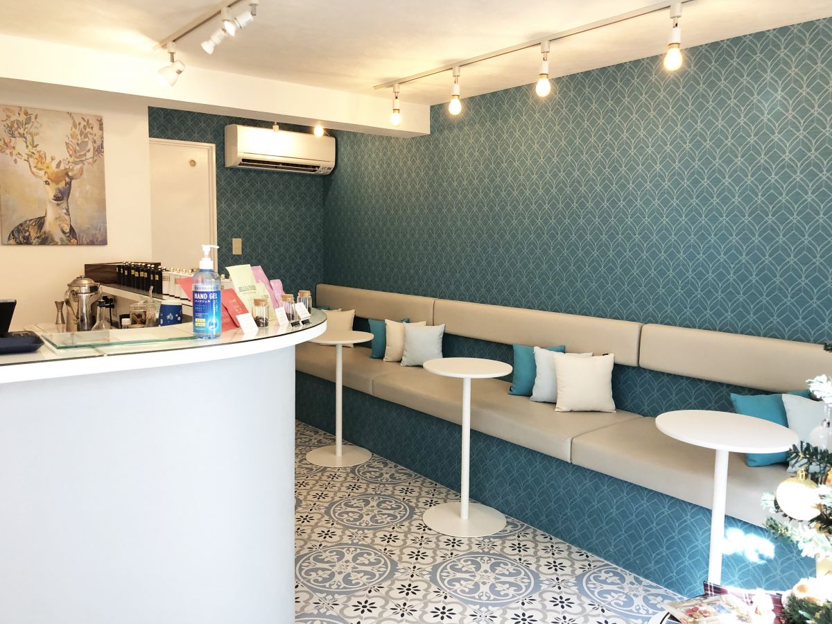 ブルーとホワイトで統一された、シンプルで爽やかな店内。全席ソファー席なので、ゆったりと過ごすことができます。