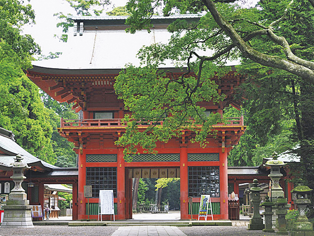 皇紀元年(紀元前660)創祀と伝えられる、常陸国一の宮で、国指定の史跡。水戸藩初代藩主・徳川頼房(とくがわよりふさ)が奉納した鮮やかな朱色の楼門は、熊本県阿蘇神社、福岡県筥崎宮(はこざきぐう)と並ぶ日本三大楼門の一つ。その先には本殿、拝殿(いずれも重要文化財)などが厳かに鎮座している。禊(みそぎ)の場として有名な御手洗池のそばには、名物のみたらしだんごを売る茶店が並び一服できる。