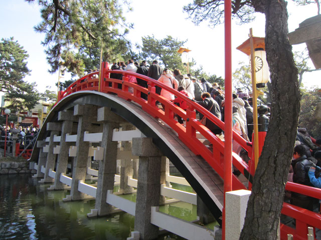 近畿でも有数の古い神社。摂津国(せっつのくに)一ノ宮として信仰され、禊祓(みそぎはらい)の神、海上安全の神として崇敬されてきた。住吉造と呼ばれる本殿の4棟が国宝、大海神社(だいかいじんじゃ)や石舞台、南門、楽所(がくしょ)が重要文化財に指定されている。本殿の南側には毎年6月14日に御田植神事が行われる御田がある。池に架かる反橋は通称太鼓橋といわれ、現在の橋脚は淀君の寄進だという。