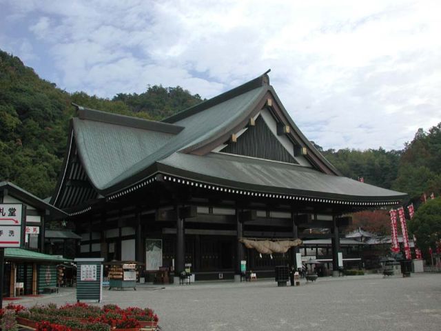 熊野三山のひとつ。鳥居をくぐって158段の石段を上ると、神門の向こうに四社殿が立つ。左から夫須美大神を祀る西御前(第一殿)、速玉大神を祀る中御前(第二殿)を合わせた相殿、その右隣に熊野造の証誠殿が立ち、主祭神の家津御子大神(けつみこのおおかみ)を祀る本殿となっている。さらに右隣の若宮(第四殿)には天照大神が祀られている。伝承によると、社殿創建は今から2020年ほど前の崇神天皇の時代。500m下流の大斎原(おおゆのはら)に鎮座していたが、明治22年(1889)の大洪水で一部社殿が流失し、現在の地に移築された。
