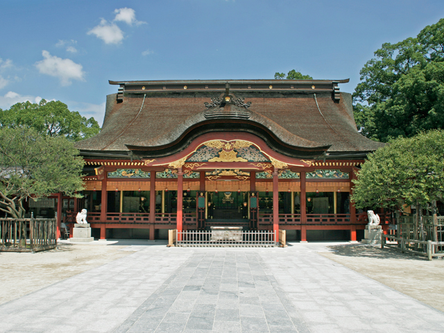 昌泰4年(901)、京都から大宰府に左遷され、この地で亡くなった菅原道真公を祀る神社。道真公が学問に秀でていたことから学問の神様として崇敬を集め、今も大勢の受験生が参拝する。心字池の太鼓橋、境内の大樟(天然記念物)などがみどころ。道真公を慕い、京から飛んで来たという御本殿(重要文化財)向かって右側の御神木・飛梅をはじめ、約6000本の梅が咲き誇る梅の名所でもある。