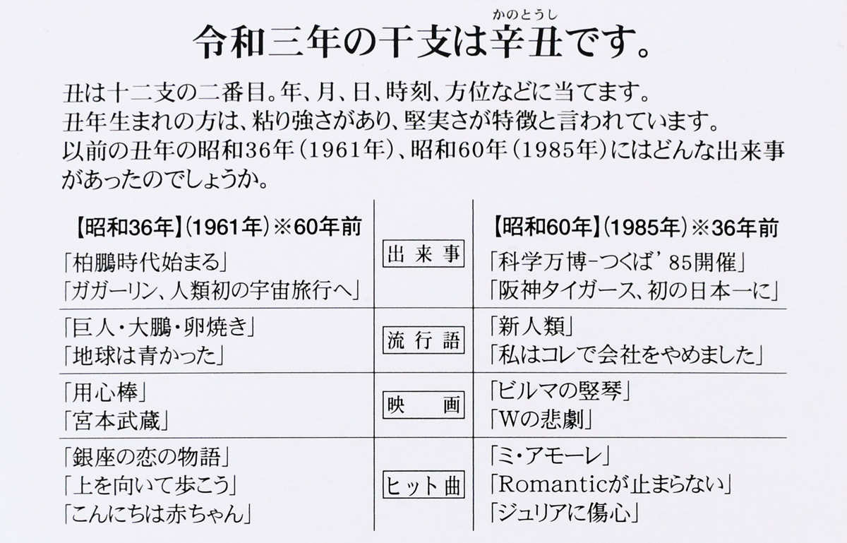 また、箱の裏側には、過去の丑年である昭和36年(1961)と、昭和60年(1985)を象徴する出来事や、流行語、映画、ヒット曲が、それぞれ箇条書きされているのもユニークなポイントです。