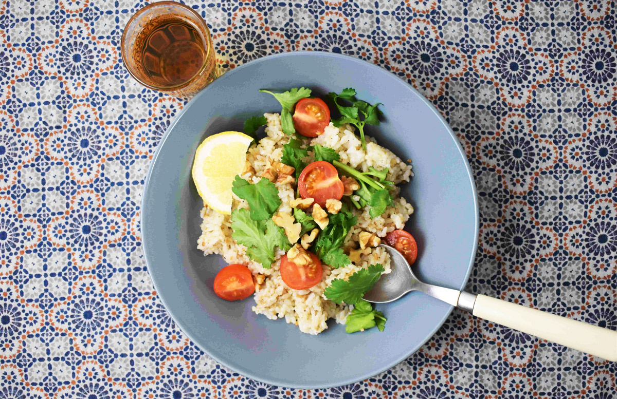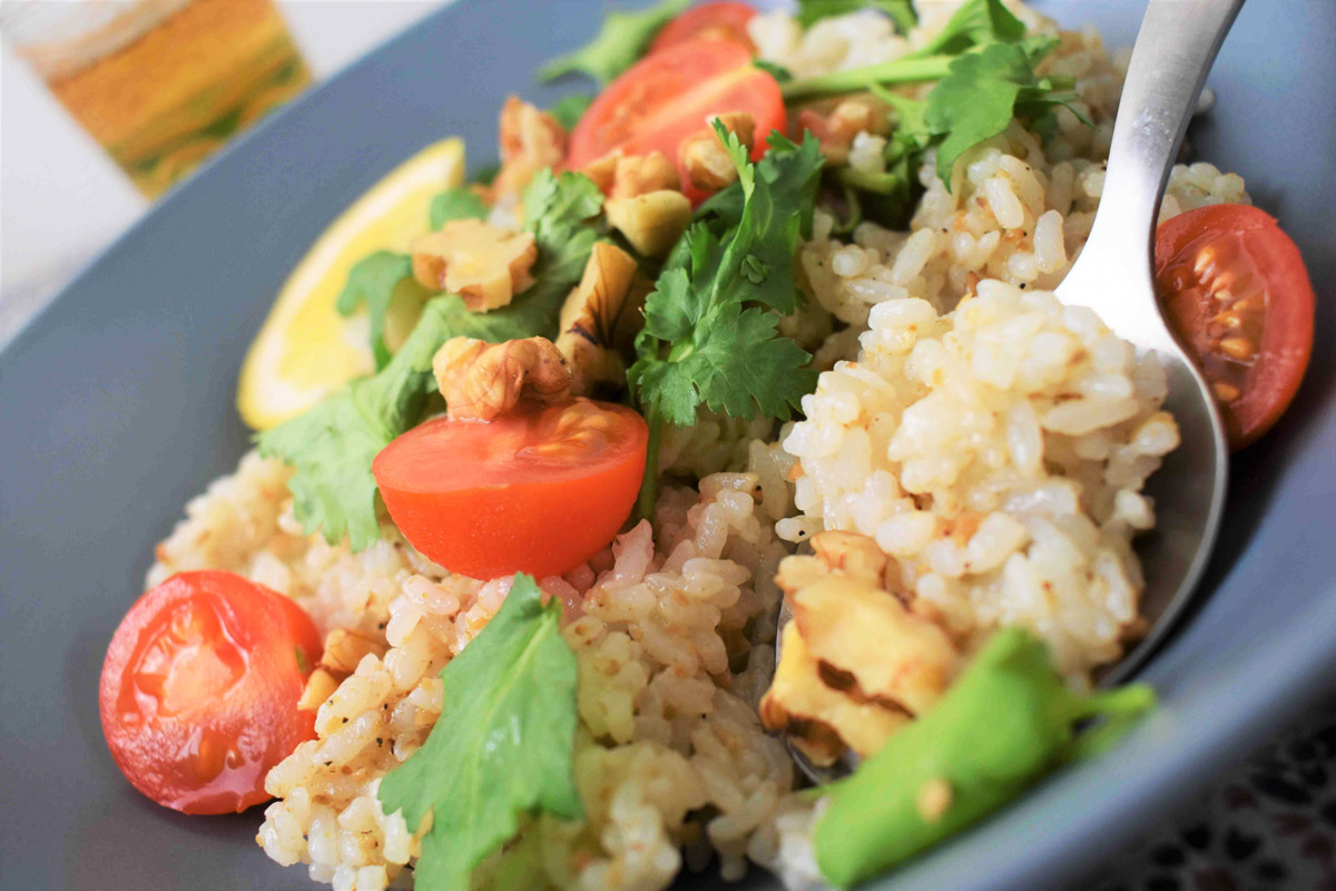 さっそく「デュカ風ナッツライスの素」を使って、ナッツライスを作ってみましょう。作り方はとっても簡単! 炊きたてのご飯1人前(約200g)に1袋を混ぜるだけ。それだけだと、ちょっと寂しいので、トッピング用に、フレッシュパクチー(コリアンダー)、ミニトマト、クルミ、レモンを用意しました。